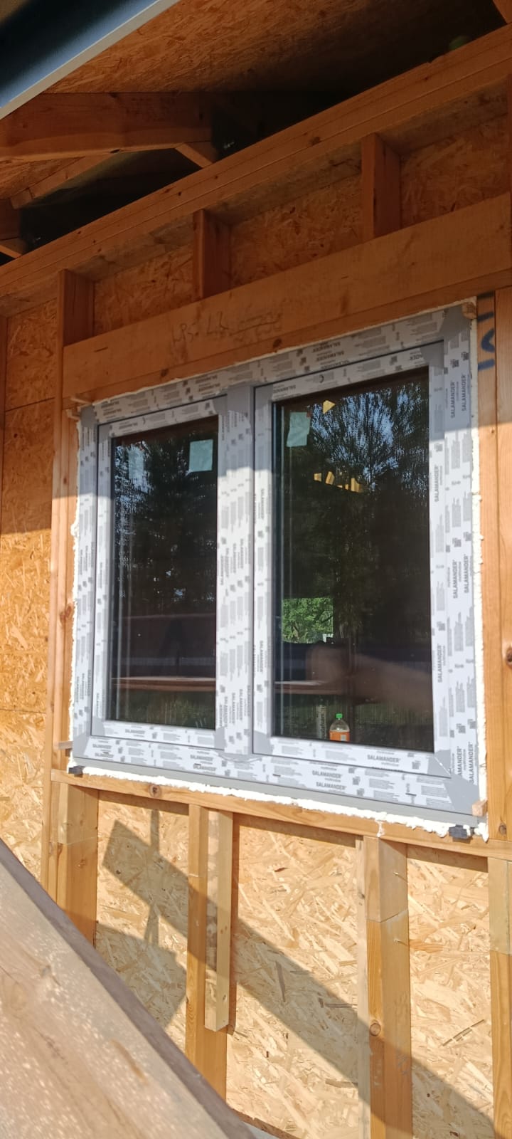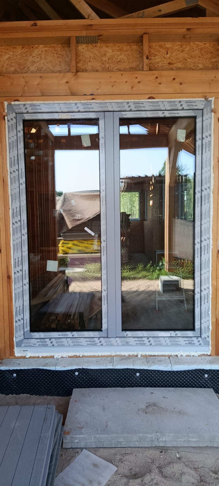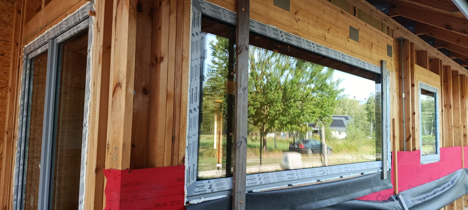 Surowy montaż 12 sztuk okien PCV BluEvolution 82 – bez ciepłych parapetów, poszerzeń i taśm, z zastosowaniem list termo. Okna w kolorze: wewnątrz biały, zewnątrz SAL 042, wyposażone w pakiet 3-szybowy, ciepłą ramkę oraz ukryte zawiasy.