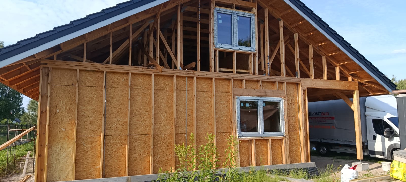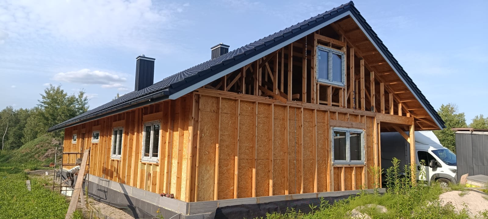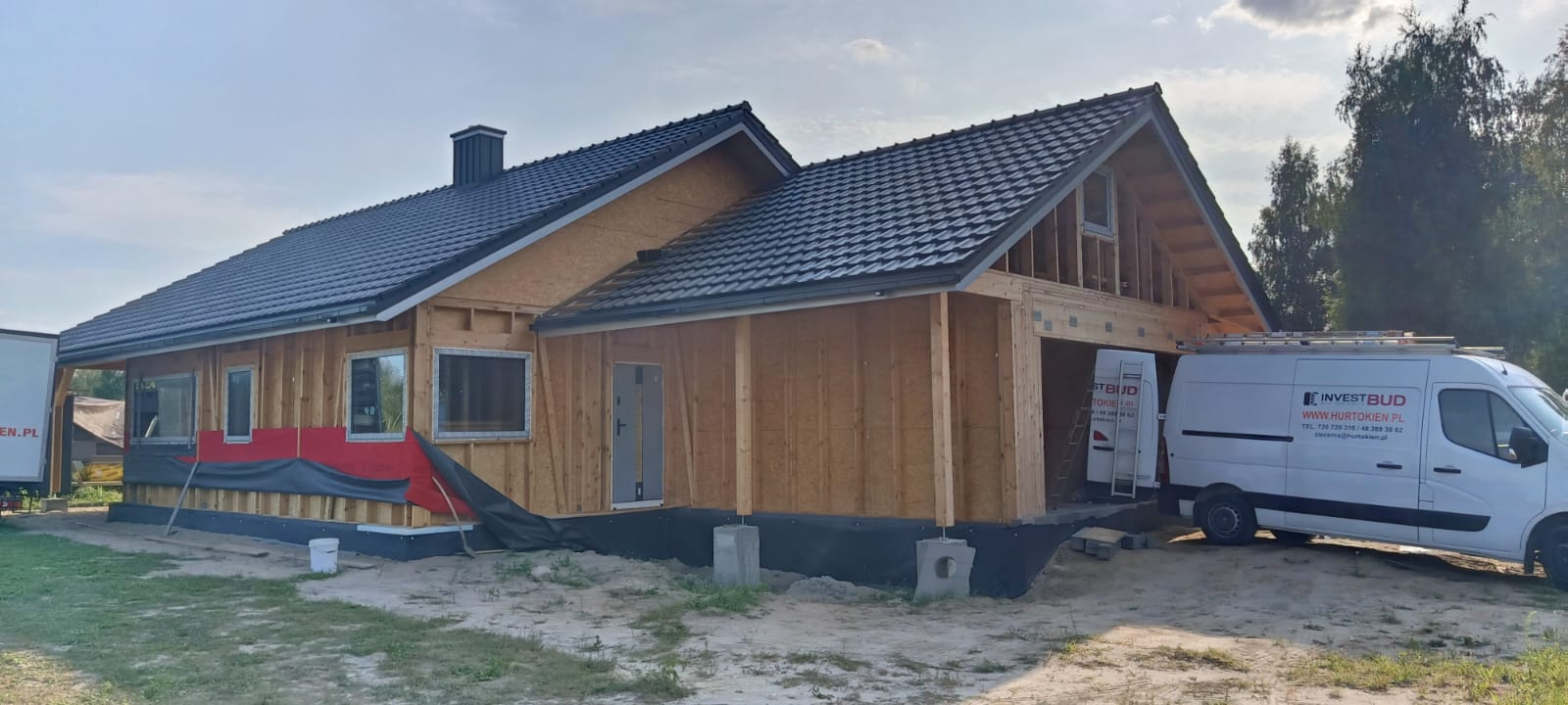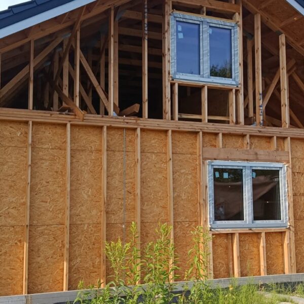 Surowy montaż 12 sztuk okien PCV BluEvolution 82 – bez ciepłych parapetów, poszerzeń i taśm, z zastosowaniem list termo. Okna w kolorze: wewnątrz biały, zewnątrz SAL 042, wyposażone w pakiet 3-szybowy, ciepłą ramkę oraz ukryte zawiasy.