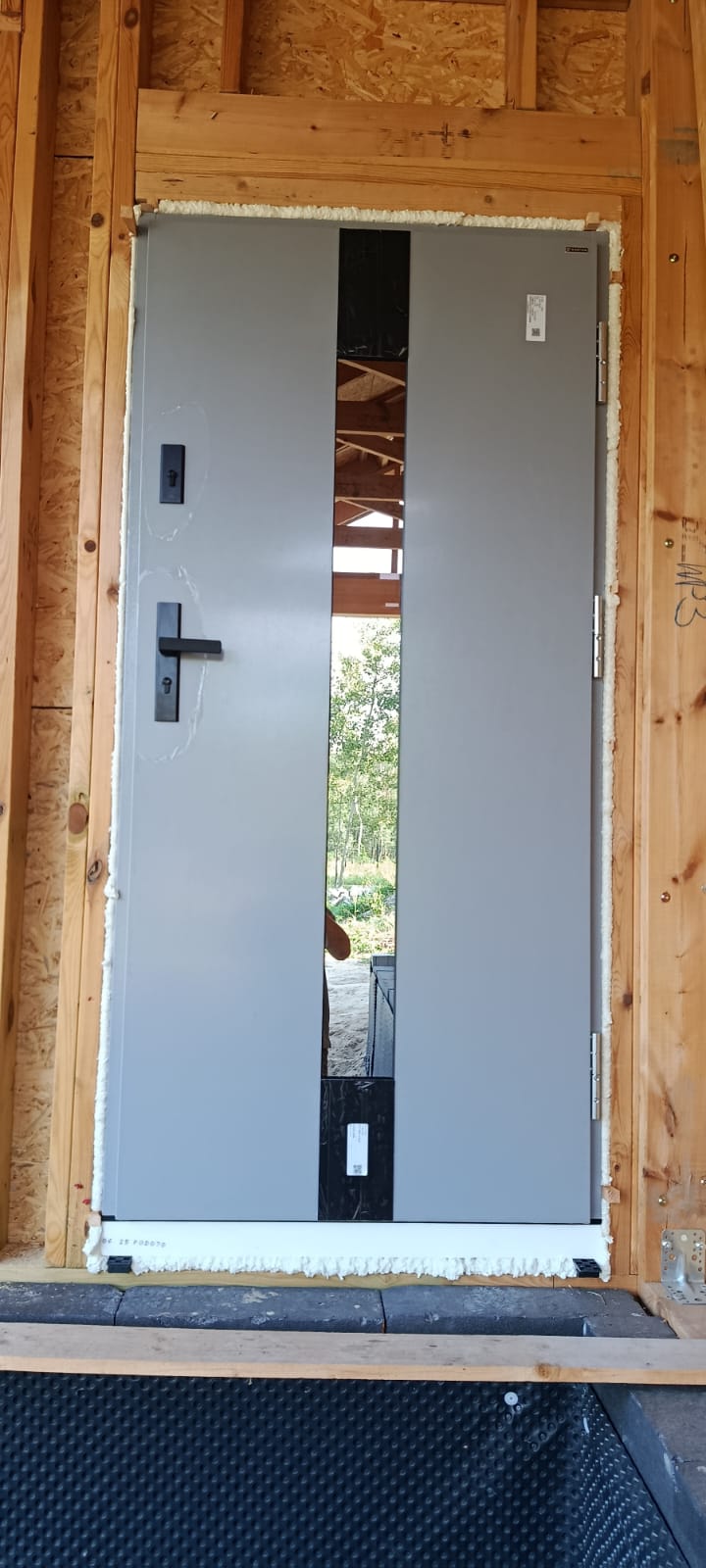 Surowy montaż drzwi stalowych Martom Arctic 72 mm, model G 626/49 Szary z szybą w formie lustra. Wymiary: 1011 × 2096 mm, kierunek: prawe, otwierane na zewnątrz. Drzwi wyposażone w czarną klamkę, czarne osłonki oraz podwalinę o wysokości 7 cm.